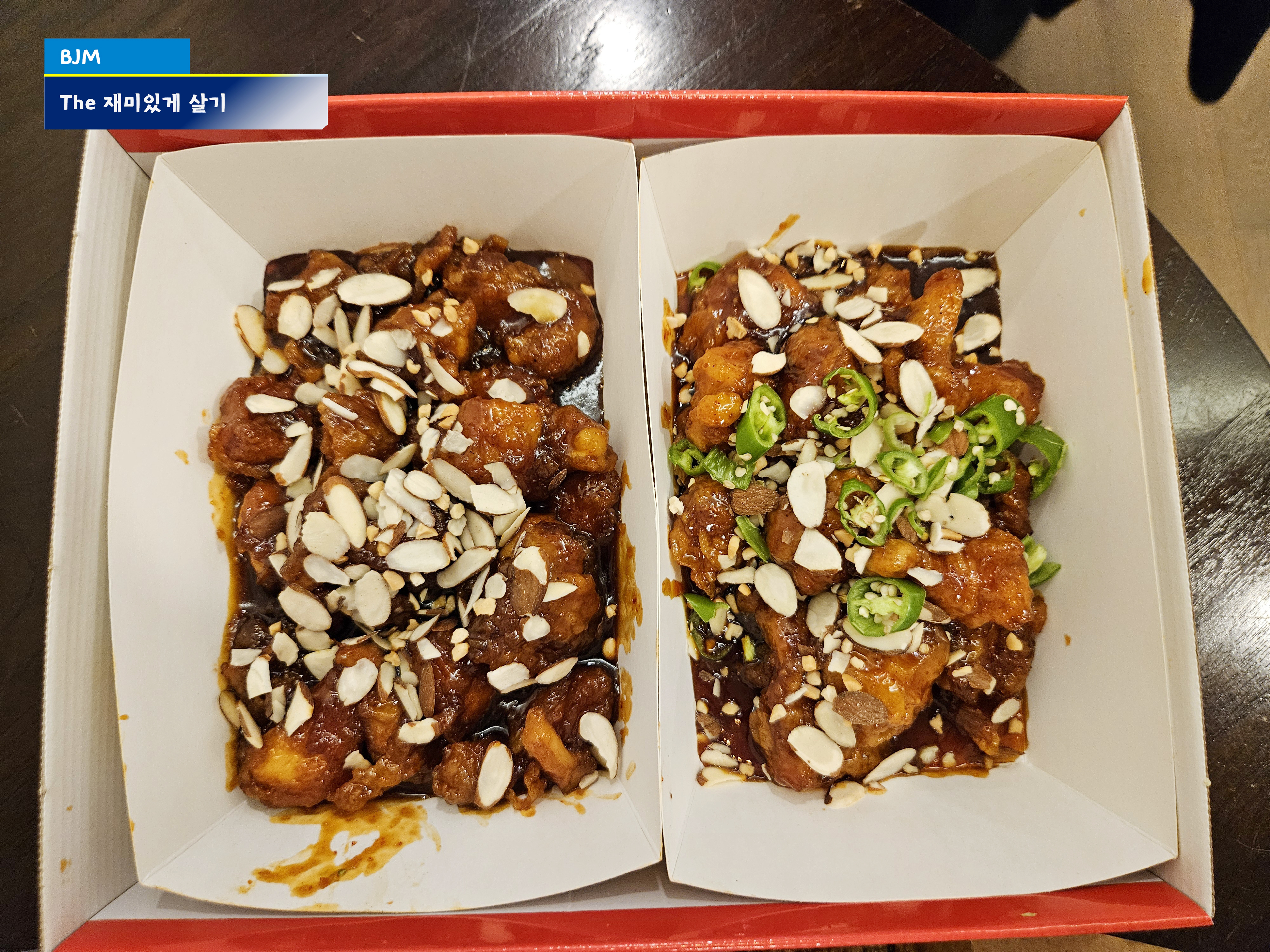 매콤한 맛과 기본 맛 반반으로 주문했는데, 매콤한 맛의 경우 알싸한 고추가 올라가 있다.