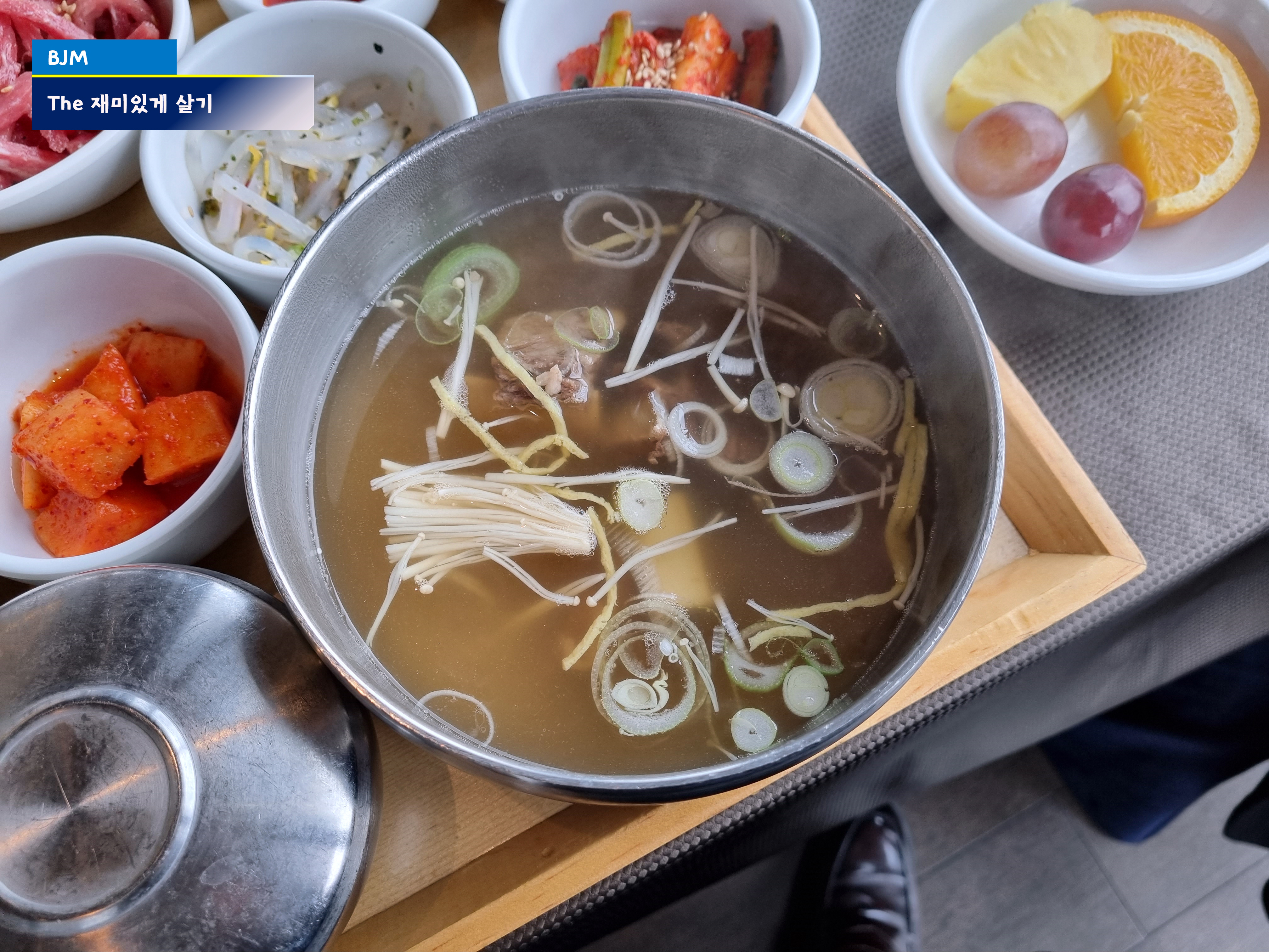 음식은 뷔페가 아니라 한상차림으로 나온다. 기본찬은 미리 세팅되어 있고, 사람이 들어오면 따뜻하게 식사할 수 있도록 갈비탕을 별도로 가져다준다.